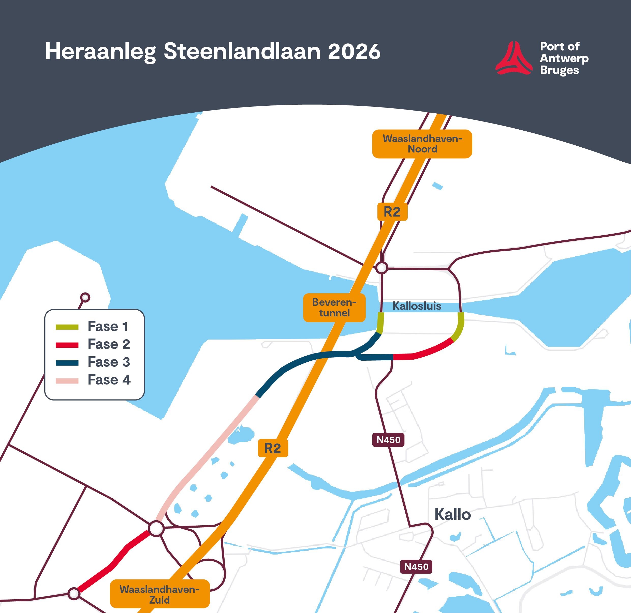 We voeren de werken vanaf maart 2026 uit omdat ze dan niet samenvallen met andere grote werken in de Waaslandhaven. Na uitgebreid overleg met o.a. de bedrijven van de Steenlandlaan, het gemeentebestuur en de hulpdiensten zijn de werken opgedeeld in 4 fasen om de bereikbaarheid van alle bedrijven te garanderen.