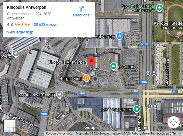 Strategically located, close to the Ring and port with free parking for around 2,500 vehicles. You can also reach Kinepolis Antwerp easily via public transport.